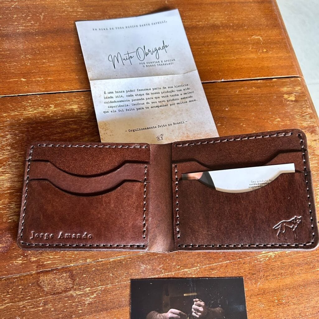 Excelente carteira, qualidade do Couro legítimo, toda feita a mão. Sem dúvida a carteira mais bonita que já tive. Parabéns pelo trabalho!