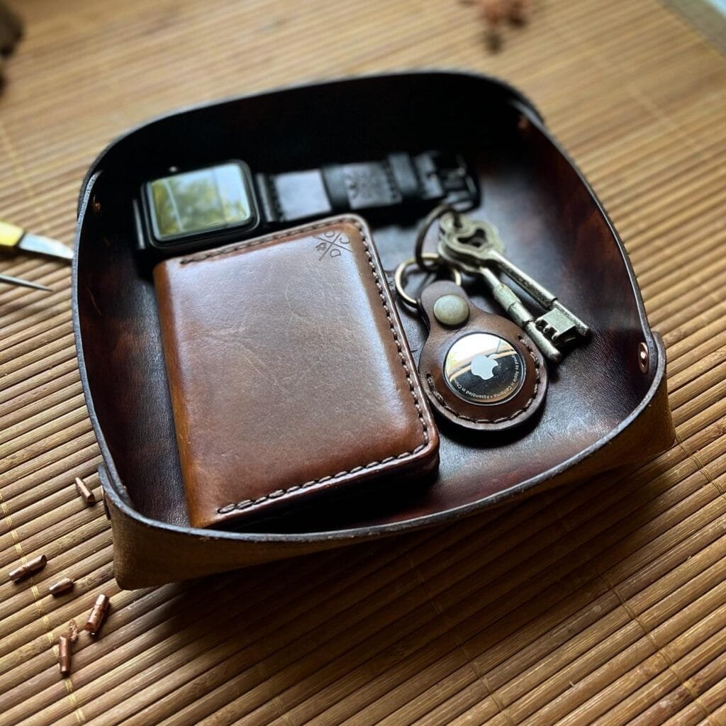 O tingimento e a costura são feitos à mão e para o polimento é utilizado cera de abelha. Quanto a costura, usamos antigas técnicas de selaria e linha encerada, proporcionando muito mais resistência e durabilidade se comparado com o ponto de bloqueio utilizados em máquinas.